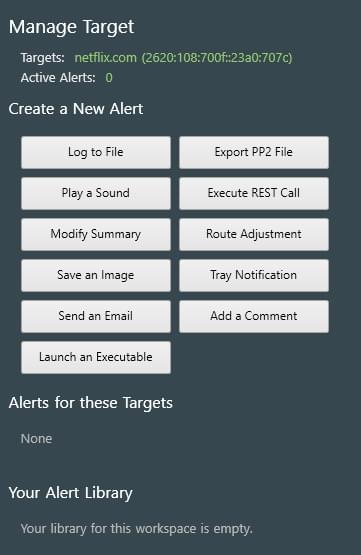 From here, we're able to create a new alert. Every alert will be stored in our alert library for use on any target.