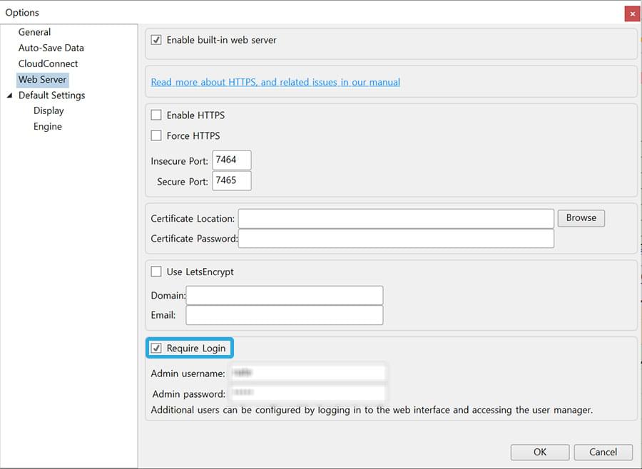 To enable multi-user management, you must first create an admin login. In the PingPlotter program, under Edit → Options → Web Server, select Require Login and enter your preferred username and password.