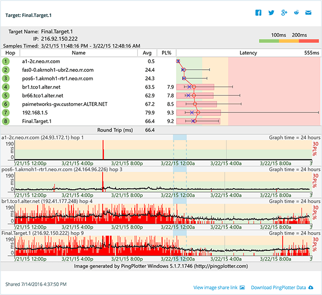 Using the share feature creates a private webpage in the cloud for the results of your PingPlotter test. The page shows a screenshot based on what the program looked like when you clicked share and provides a downloadable file containing up to 24 hours of PingPlotter results.