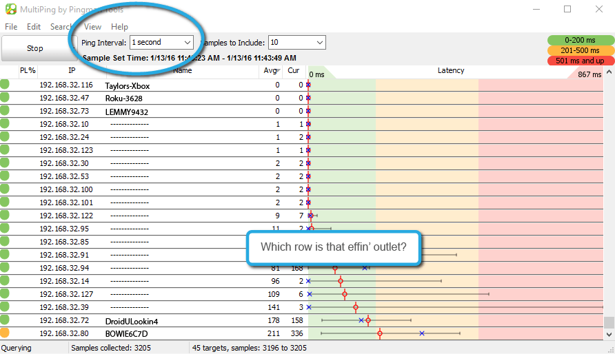 After your device is powered down, check MultiPing and find the row with a full red bar in the latency graph. A full red bar means 100% packet loss AKA the device is completely unresponsive.